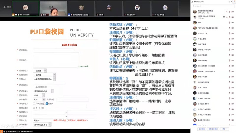首先,社团服务中心主任邢斯淇向社团负责人介绍社团服务中心的机构设置及分工情况,介绍了各部门职能,以增进各部门与各社团之间的工作配合度。接着,社团服务中心副主任胡安康讲解了学生社团活动申报、组织及总结考核要求,为今后各项社团活动的开展明确了具体规范。随后,李殷老师对2021年度星级社团申报评审过程及结果进行通报,指出上一年度星级认定社团填报存在的问题,督促相关社团落实整改,并对组织建设成绩优异的社团进行鼓励。最后,原团委办公室主任徐琪详述了PU校园平台在社团活动管理中的应用及注意事项,以及如何通过PU校园平台规范学生社团的组织建设、活动开展与总结提高。