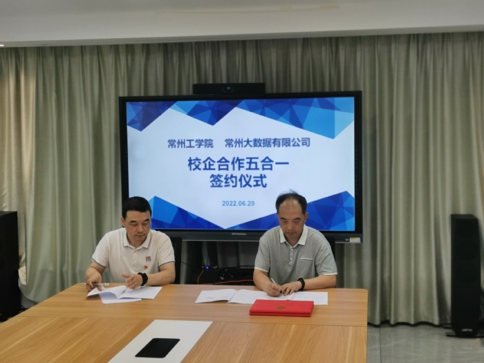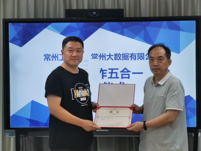 6月29日下午,理学院院长兼党总支书记陈荣军携数据科学与大数据技术专业学科相关人员赴常州大数据有限公司,与常州大数据有限公司董事长、总经理单志刚、副总经理顾斌,签订校企合作“五合一”基地合作协议,并向这两位行业专家颁发常州工学院兼职教授聘书。