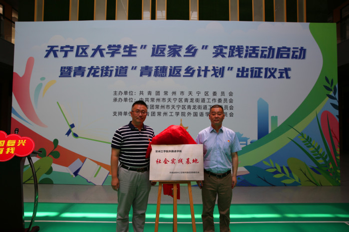 仪式上,青龙街道党工委书记郑峰介绍了青龙街道的基本情况和近几年取得的成果,阐述了社区基层治理特点和大学生社会实践基地的开展情况。刘一鸣从常州工学院外国语学院办学理念、人才培养、专业设置、产教融合、学生就业等方面详细介绍了学院情况,希望校地双方建立深入沟通、密切联系的纽带,提高大学生的社会实践能力,推动越来越多的高校毕业生留常就业创业。随后,双方举行了“社会实践基地”授牌仪式。