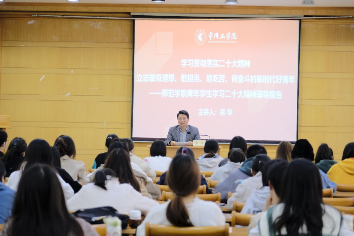 会上,学院党委书记肖华以《学习贯彻落实二十大精神,立志做有理想、敢担当、能吃苦、肯奋斗的新时代青年》为题作辅导报告。他向大家解读了党的二十大召开的历史背景、会议主要内容和重要历史意义,要求大家务必认真学习会议内容,以实际行动学习贯彻好党的二十大精神;他结合历史与现实,从青年工作的地位、青年思想引领的主要任务和内容、青年工作的方法论、青年与时代的深刻关系等四个方面详细阐明了习近平总书记在党的二十大报告中关于青年和青年工作的重要论述,号召学院全体青年学生争做有理想、敢担当、能吃苦、肯奋斗的新时代好青年。结合师范学院发展实际,肖华提出,要持续强化党建引领,要以党的二十大精神为指引,全院师生党员和学生干部要率先垂范,带头学、带头干,实现两代师表一起塑造,共建美好新师范,共育新时代“四有”好老师。