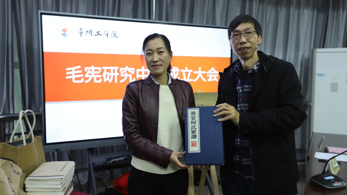 常州市华音公益文化基金会(筹)董事长毛卫成和人文学院教授委员会主任陆克寒教授为研究中心揭牌,常州市谱牒与祠堂文化研究会会长朱炳国等为学院赠送家谱和样书。