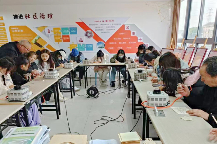 亲历非遗之美 12月2日,2022级秘书学专业学生到天宁区雕庄街道采菱公寓参加非遗“烙画”技艺体验实践。