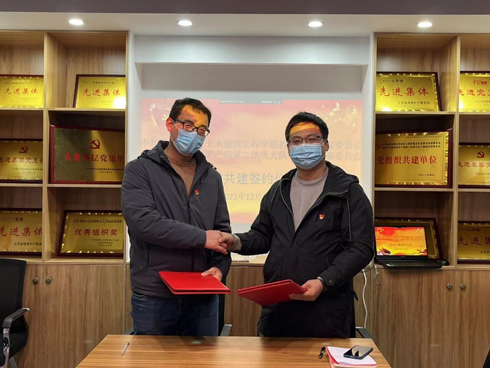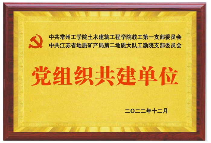 双方举行了授牌仪式,并共同签署《中共常州工学院土木与建筑工程学院教工第一支部委员会与中共江苏省地质矿产局第二地质大队工勘院支部委员会结对共建协议书》,商讨了共建支部工作标准化、联合开展党员教育、联合开展党组织生活、积极拓展活动外延、联合共促发展等共建内容,明确了双方的共建责任。