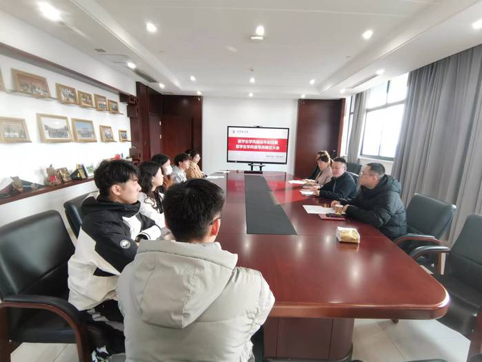 近期,国际交流学院召开留学生学风建设年启动暨留学生学风督导员聘任会议,国际交流学院副院长金政、经济与管理学院党委副书记郭峥春,留学生工作办公室全体教师,以及留学生代表、本次拟聘留学生学风督导员参加会议。