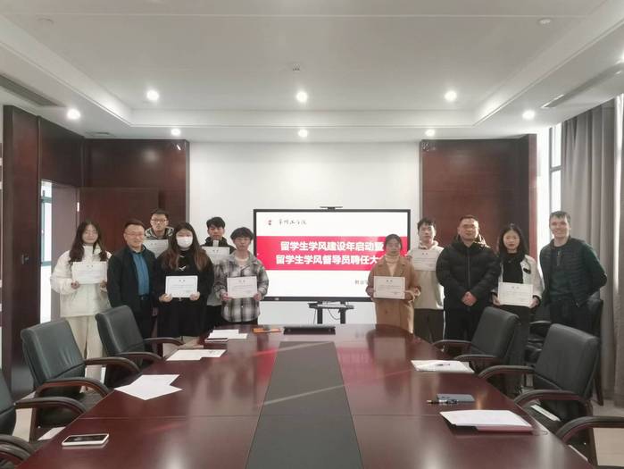 会上,金政简要介绍了2023年留学生学风建设年活动的总体目标、具体举措,以及本次招募留学生学风督导员初衷、主要工作内容和要求。郭峥春勉励学风督导员们要切实履行岗位职责,在工作中秉持高度的责任心,在“督”好留学生课堂考勤的同时,也要“导”好留学生的学习,与留学生结伴学习、共同进步。随后,金政和郭峥春共同为来自经济与管理学院、电气信息工程学院和计算机信息工程学院10名学生颁发了聘书。