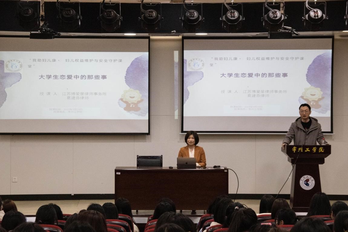 3月14日晚,由新北区妇联、新北团区委、计算机信息工程学院团委共同主办的“女大学生婚恋观讲座”在图书馆一楼报告厅举行。本次讲座邀请江苏博爱星律师事务所葛建芬律师和常州市心理咨询师协会王清莲副教授主讲,150余名女大学生参加此次讲座。