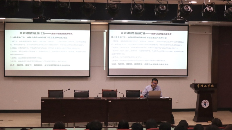 本次讲座特别邀请广发证券常州分公司总经理陈阳主讲。讲座中,陈阳老师分析了当前金融行业现状及特点,介绍了金融类专业及其相关行业的基本情况,并表示财富经济业务未来发展前景广阔,同学们要对自己专业有信心,努力学习专业知识,提升自己的核心竞争力。最后,陈阳老师对于同学们关心的热点、难点问题给予了详细的解答,现场气氛热烈。