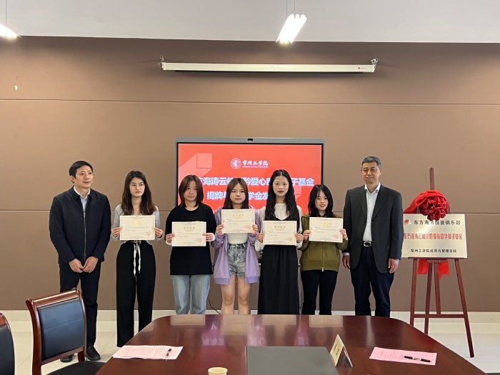 随后,张海涛与校友联谊办主任冯平平共同为“东方海涛云贵川黔爱心助学种子基金”揭牌,并和院党委书记、院长谢金楼共同为获得2022年“东方海涛云桂川黔爱心助学种子基金”奖学金的20名同学颁发荣誉证书。2020级工商管理专业学生黄娟作为获奖代表发言,对校友返校表达了热烈欢迎和诚挚感谢,并表示将不辜负校友的殷切期望和母校的培育之情。
