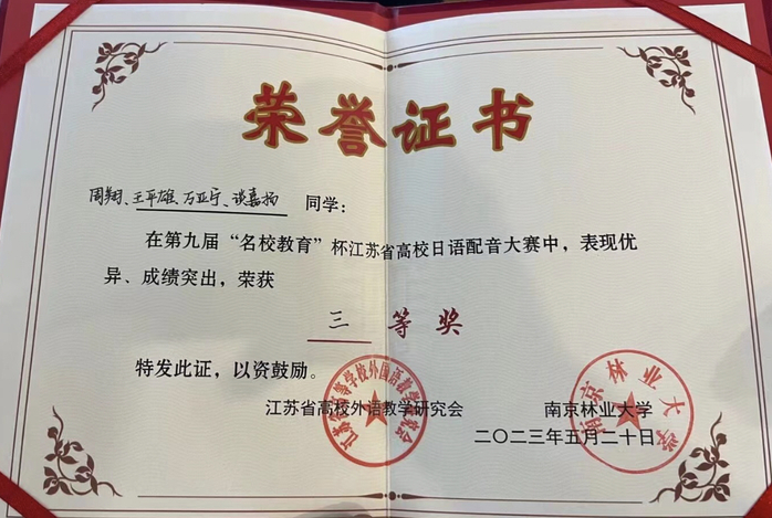 团队成员王平雄、万亚宁,周翔和谈嘉扬凭借扎实的语言功底和配音技巧,表现突出,荣获三等奖。