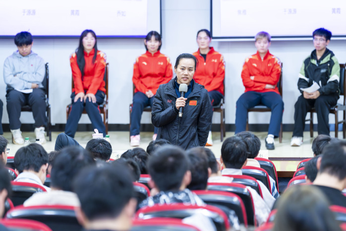 互动中,学生们围绕“运动生涯规划”“学业与训练平衡”等话题提问。针对“手球项目不够热门”的质疑,队员黄霞以“我们用日复一日的坚持和连续夺冠的战绩回应所有质疑”作答,并鼓励学子将挑战化为成长阶梯。队员们还分享了结缘手球的初心、突破极限的感悟,传授“拆解目标、逐步突破”的成长方法,寄语学子“以热爱为帆,以坚韧为桨”。