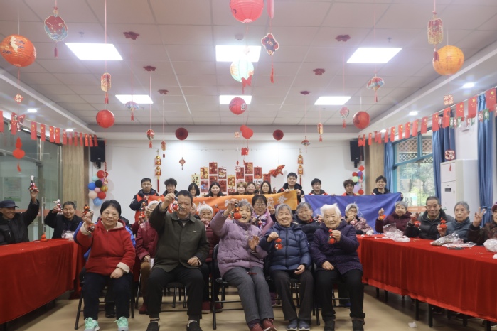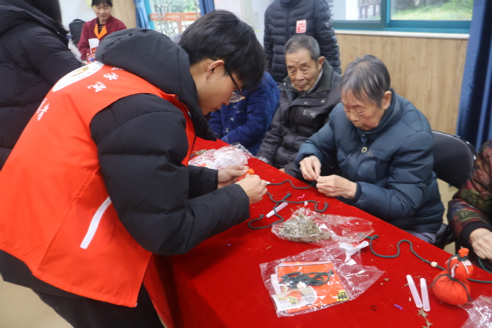 福禄香囊DIY环节中,同学们手把手协助老人们填充艾草香料、调整香囊造型,制作出寄托“福禄平安”寓意的葫芦香囊,在互动中传递对长者的关爱与陪伴。
