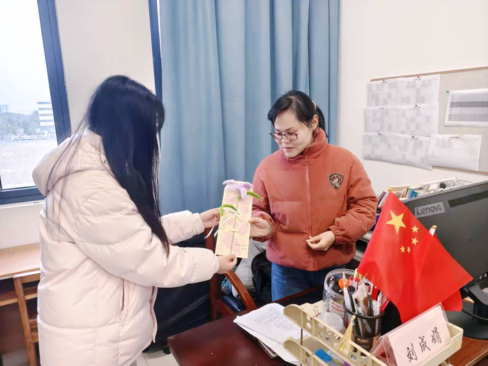 “指尖生花DIY”环节中,同学们领取扭扭棒工具,发挥巧思制作手工花,并搭配手写贺卡,将这份心意赠予学校女性职工,以温馨方式表达敬意。